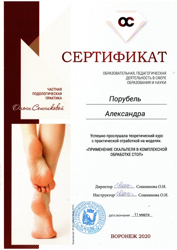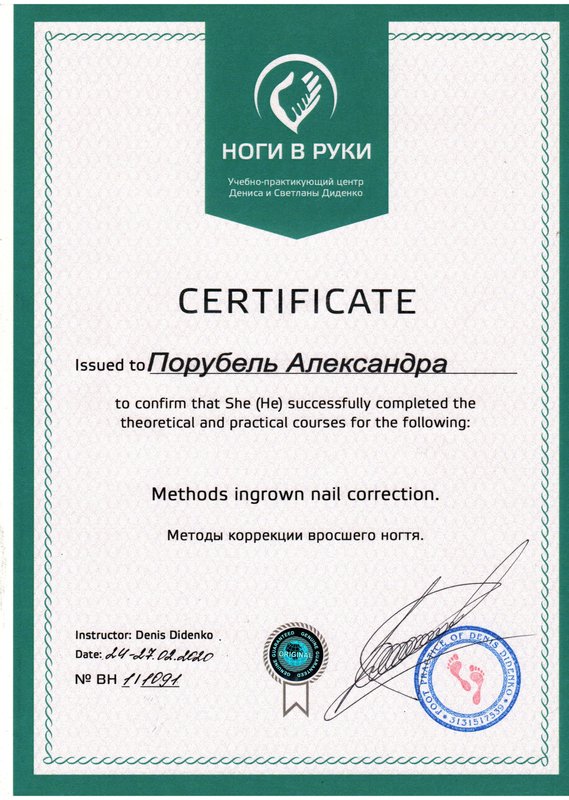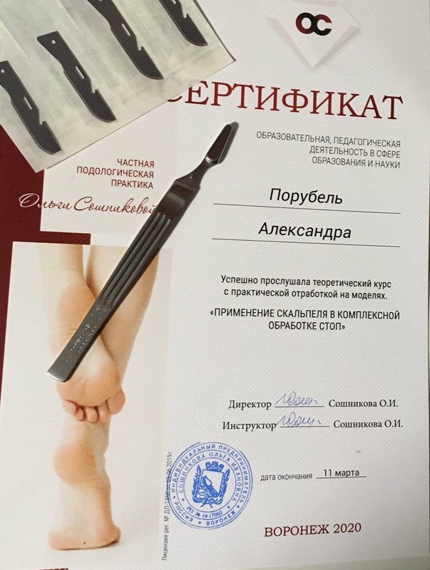 Вполне доволен полученным результатом от процедур и периодически за услугами по педикюру к Александре Порубель обращаюсь. Она - профессионал своего дела! Александра опытная и знающая, впервые я пришёл к ней с бородавкой на ноге, которую подхватил на юге. Ранее мне уже дважды её удаляли под корень, но она вырастала снова и больше, до 5 мм дошла, я мучился 1,5-2 года. Но Александра мне помогла и использовала технологию из Испании, и, с помощью препаратов, полностью избавила меня от недуга. И устраивает территориальное расположение центра, изначально пришёл в него по рекомендации от другого мастера.