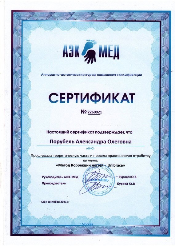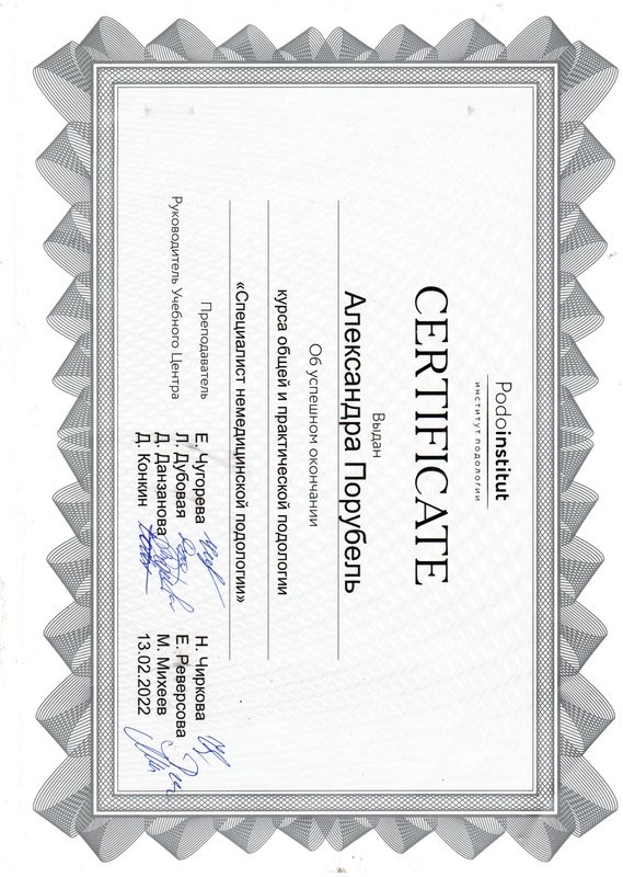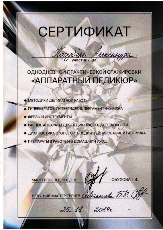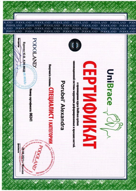 Постоянно обращаюсь к подологу Александре Порубель, она в последний раз выполнила для меня процедуру по педикюру с покрытием. С работой она справилась аккуратно и эффективно. Александра - отличная специалист, в своём деле разбирается! Доверяю ей уже 2 года, в отношении патологии она оказывает для меня отличные услуги.